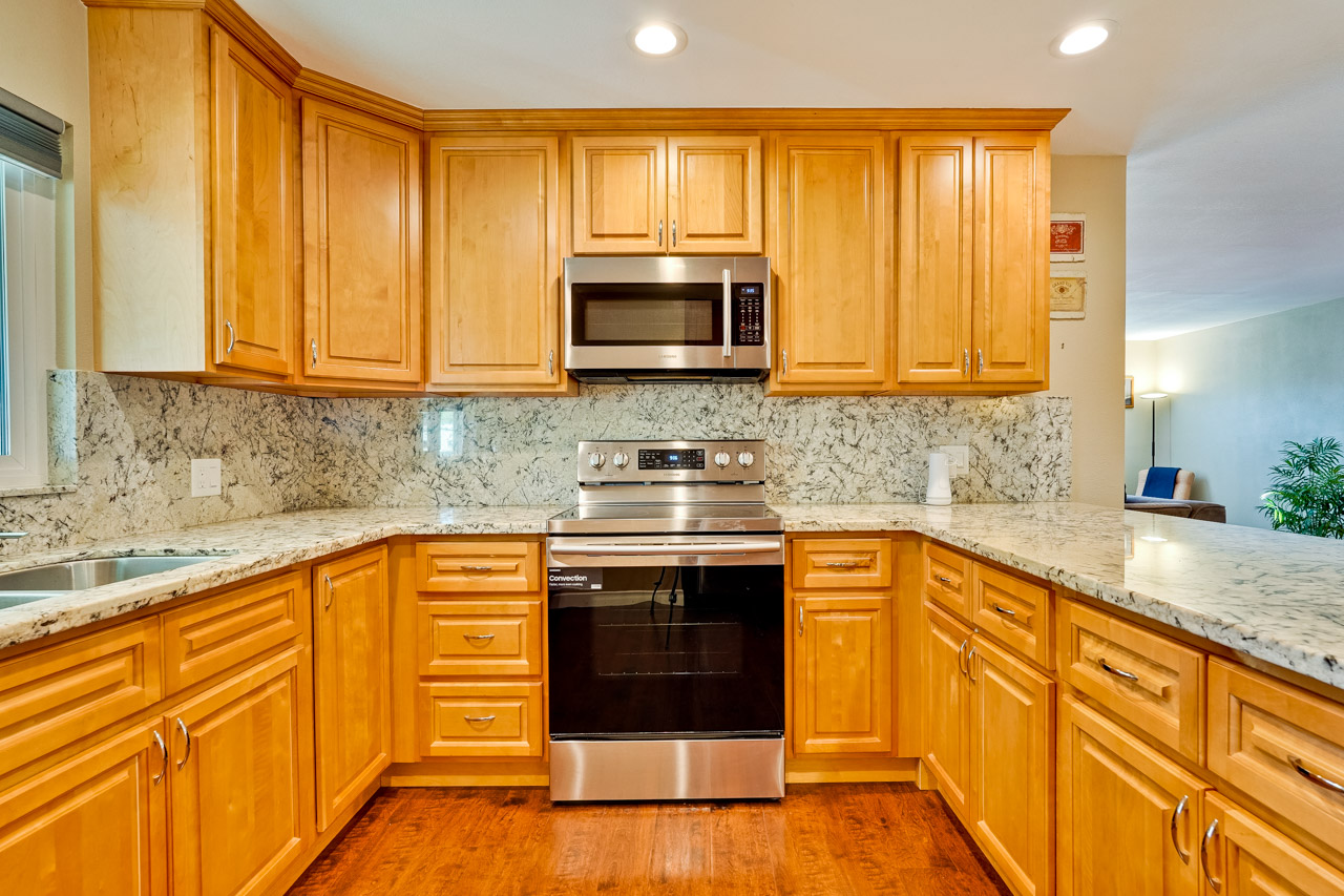 GRAND KITCHEN with Custom Cabinetry, ELEGANT Granite Counters & Backsplash, S/S Appliances, Convection Oven, Built-in Microwave and BEAUTIFUL Views*