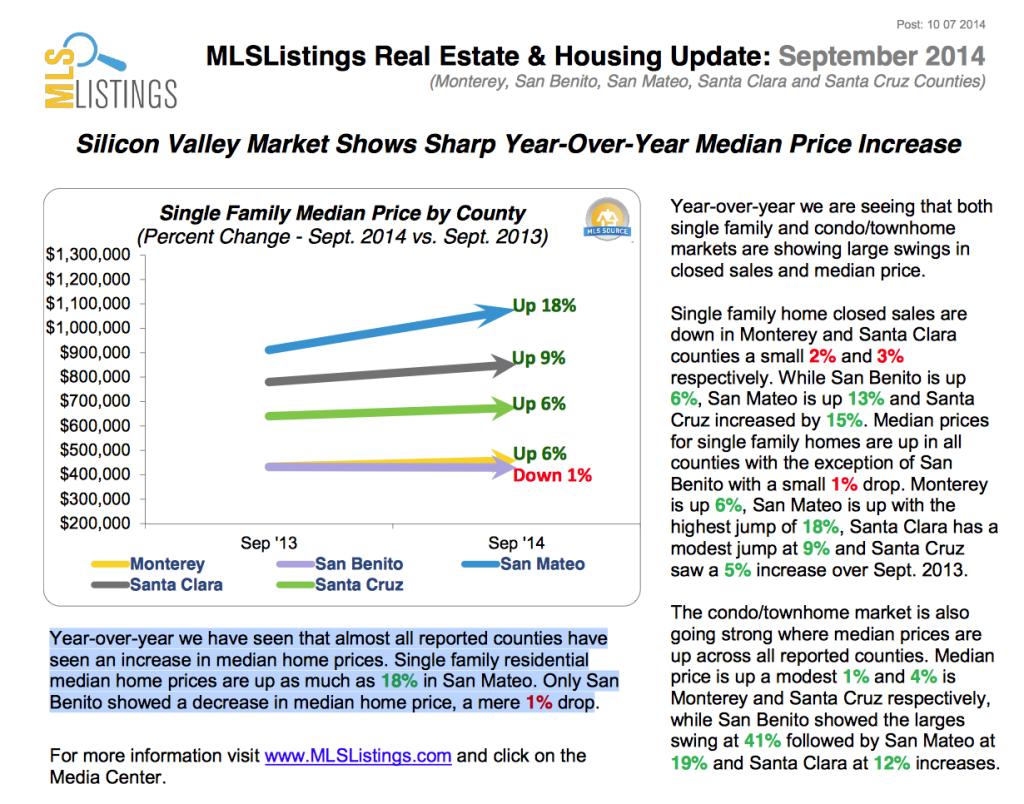 Single family home closed sales are down in Monterey and Santa Clara counties a small 2% and 3% respectively. While San Benito is up 6%, San Mateo is up 13% and Santa Cruz increased by 15%. Median prices for single family homes are up in all counties with the exception of San Benito with a small 1% drop. Monterey is up 6%, San Mateo is up with the highest jump of 18%, Santa Clara has a modest jump at 9% and Santa Cruz saw a 5% increase over Sept. 2013. Continue reading