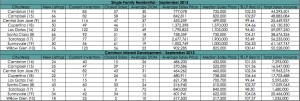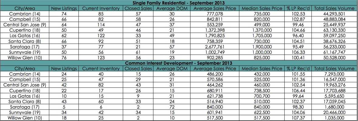 Just inSanta Clara County September 2013 Real Estate Statistics for: New Listings, Current Inventory, Closed Sales, Average Days on Market (DOM), Average Sales Price, Percentage of List Price Received, and the Total Sales Volume forĀ  areas Cambrian, Campbell, Central San Jose, Cupertino, Los Gatos, Santa Clara, Saratoga, Sunnyvale and Willow Glen for both Single Family Residential Common Interest Development Properties.