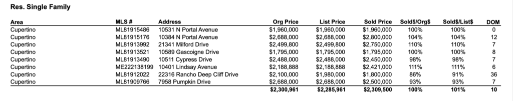 January, 2023 – The Sales Prices posted, on average, are at 101% above list price, in the Silicon Valley City of Cupertino, CA.